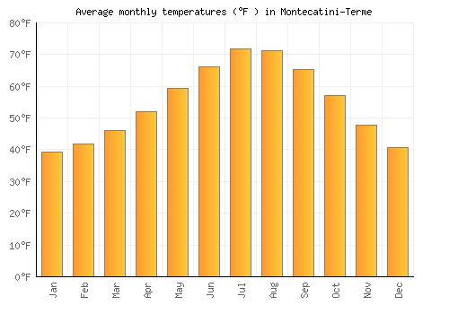 The bar chart below shows the average monthly peak daytime temperatures at Montecatini-Terme