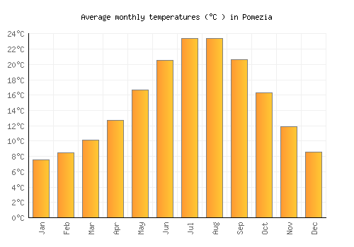 The bar chart below shows the average monthly peak daytime temperatures at Pomezia