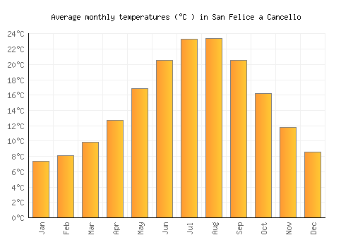 The bar chart below shows the average monthly peak daytime temperatures at San Felice a Cancello