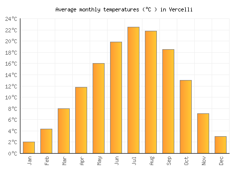 The bar chart below shows the average monthly peak daytime temperatures at Vercelli