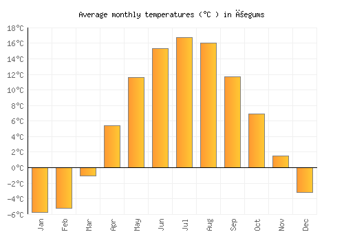 The bar chart below shows the average monthly peak daytime temperatures at Ķegums