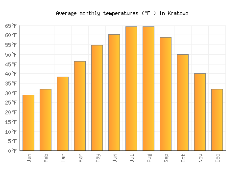 The bar chart below shows the average monthly peak daytime temperatures at Kratovo