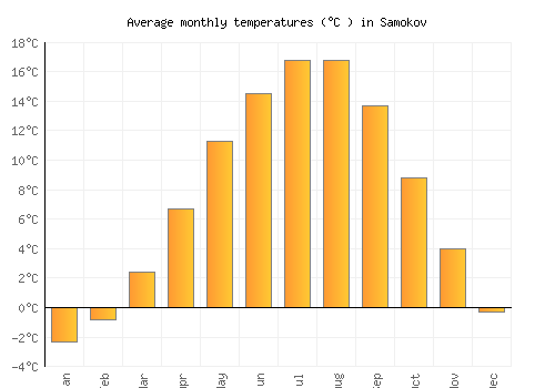 The bar chart below shows the average monthly peak daytime temperatures at Samokov