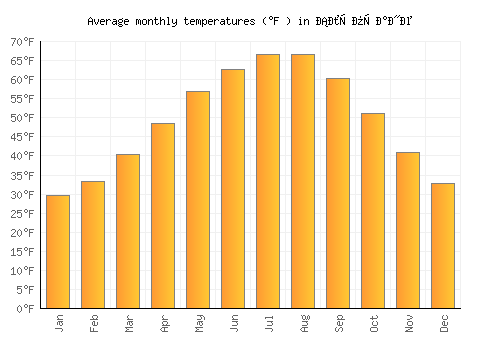 | Max °F | 29.5 | 33.3 | 40.3 | 48.4 | 57 | 62.6 | 66.6 | 66.6 | 60.4 | 51.1 | 40.8 | 32.7 |