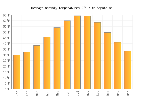 The bar chart below shows the average monthly peak daytime temperatures at Sopotnica