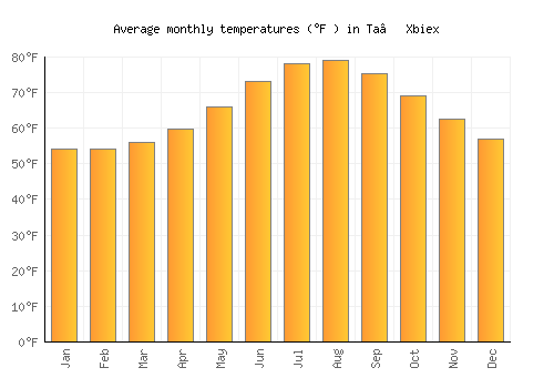 The bar chart below shows the average monthly peak daytime temperatures at Ta’ Xbiex