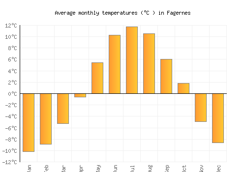 The bar chart below shows the average monthly peak daytime temperatures at Fagernes