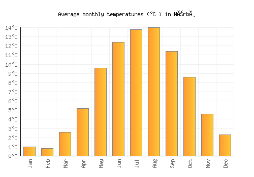 The bar chart below shows the average monthly peak daytime temperatures at Nærbø