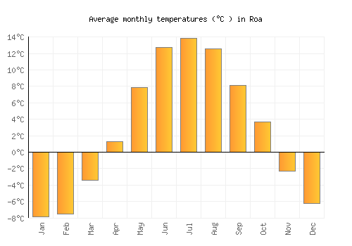 The bar chart below shows the average monthly peak daytime temperatures at Roa