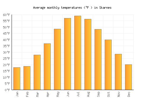 The bar chart below shows the average monthly peak daytime temperatures at Skarnes