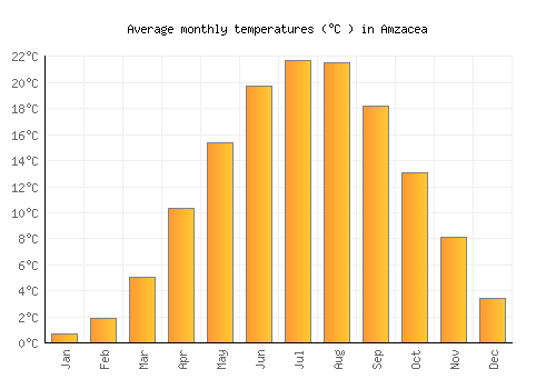 The bar chart below shows the average monthly peak daytime temperatures at Amzacea