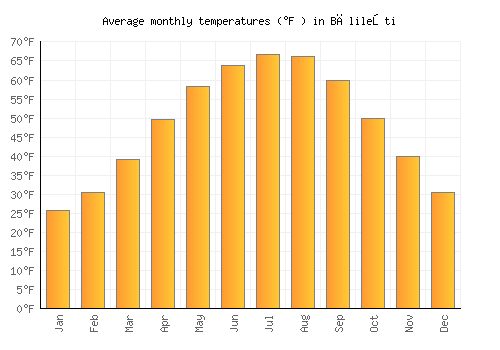 The bar chart below shows the average monthly peak daytime temperatures at Bălileşti