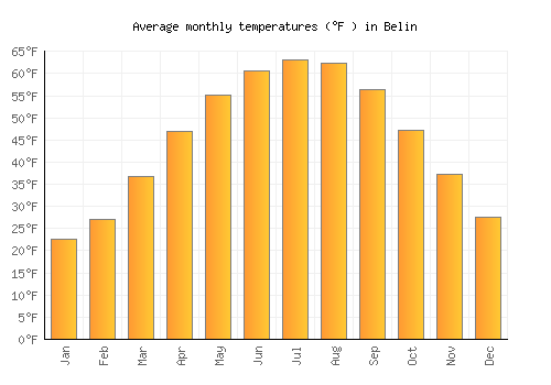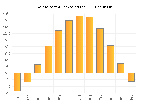 The bar chart below shows the average monthly peak daytime temperatures at Belin