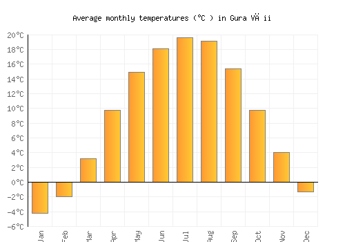 The bar chart below shows the average monthly peak daytime temperatures at Gura Văii