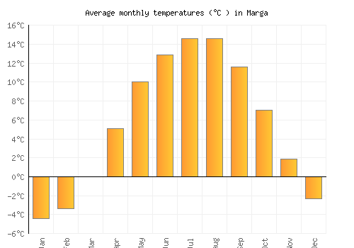 The bar chart below shows the average monthly peak daytime temperatures at Marga