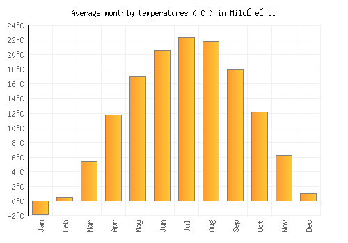 The bar chart below shows the average monthly peak daytime temperatures at Miloşeşti