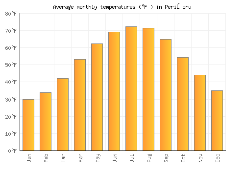 The bar chart below shows the average monthly peak daytime temperatures at Perişoru
