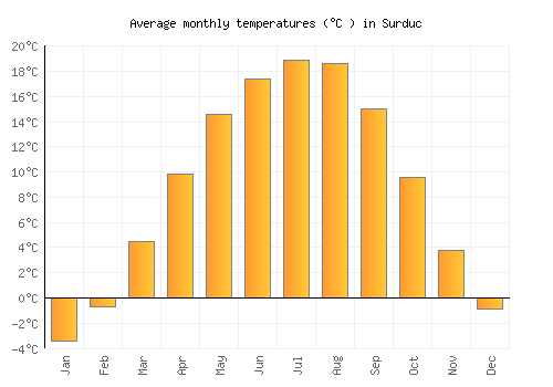 The bar chart below shows the average monthly peak daytime temperatures at Surduc