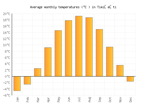 The bar chart below shows the average monthly peak daytime temperatures at Timişeşti