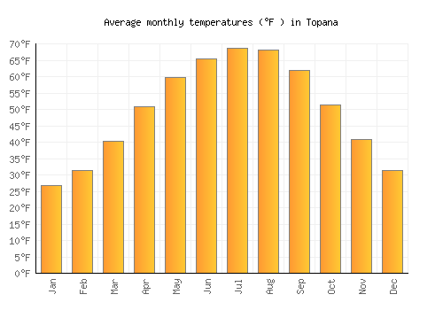 The bar chart below shows the average monthly peak daytime temperatures at Topana