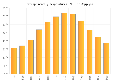 The bar chart below shows the average monthly peak daytime temperatures at Adygeysk