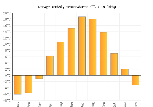 The bar chart below shows the average monthly peak daytime temperatures at Akhty