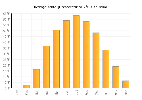 The bar chart below shows the average monthly peak daytime temperatures at Bakal