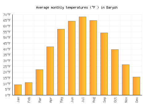 The bar chart below shows the average monthly peak daytime temperatures at Barysh
