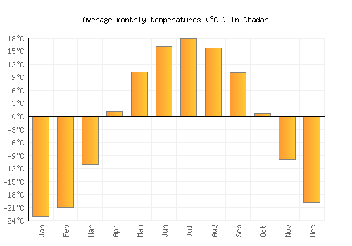 The bar chart below shows the average monthly peak daytime temperatures at Chadan