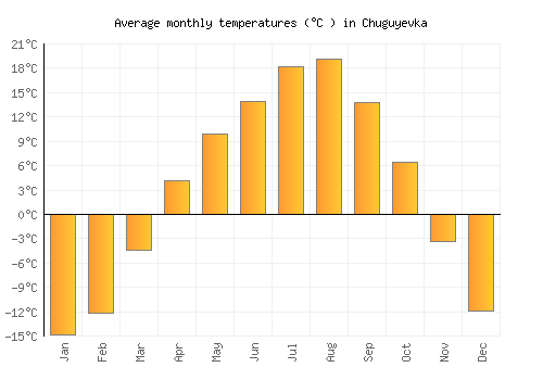 The bar chart below shows the average monthly peak daytime temperatures at Chuguyevka