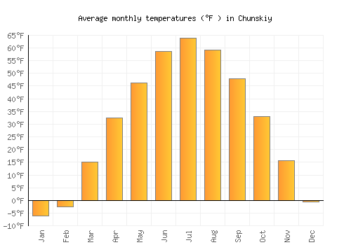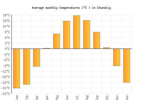 The bar chart below shows the average monthly peak daytime temperatures at Chunskiy