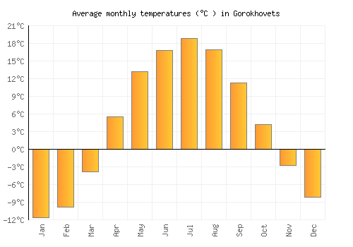 The bar chart below shows the average monthly peak daytime temperatures at Gorokhovets