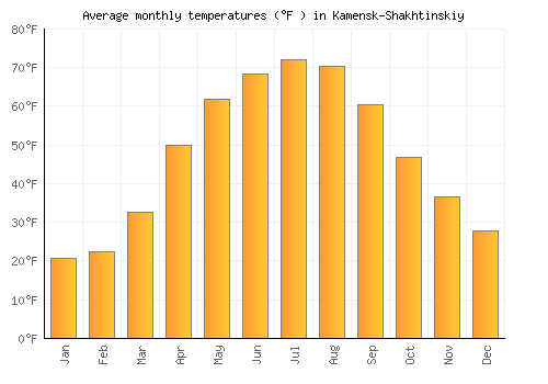 The bar chart below shows the average monthly peak daytime temperatures at Kamensk-Shakhtinskiy