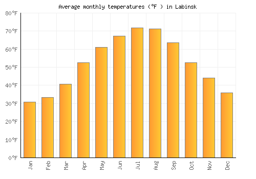 The bar chart below shows the average monthly peak daytime temperatures at Labinsk