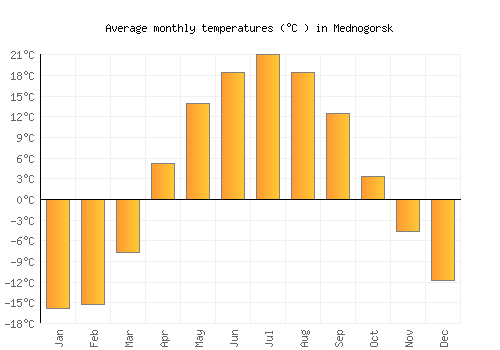 The bar chart below shows the average monthly peak daytime temperatures at Mednogorsk