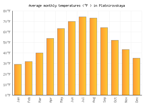 The bar chart below shows the average monthly peak daytime temperatures at Platnirovskaya
