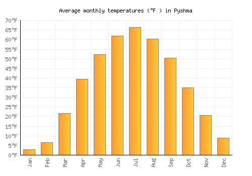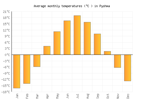 The bar chart below shows the average monthly peak daytime temperatures at Pyshma