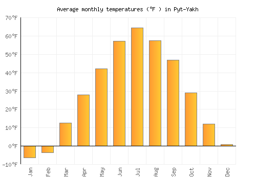 The bar chart below shows the average monthly peak daytime temperatures at Pyt-Yakh