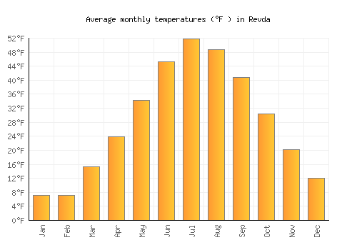 The bar chart below shows the average monthly peak daytime temperatures at Revda