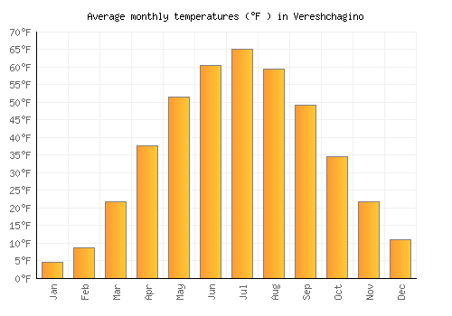 The bar chart below shows the average monthly peak daytime temperatures at Vereshchagino