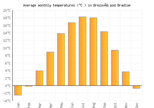 The bar chart below shows the average monthly peak daytime temperatures at Brezová pod Bradlom
