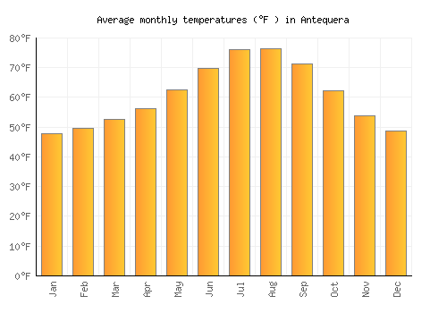 The bar chart below shows the average monthly peak daytime temperatures at Antequera