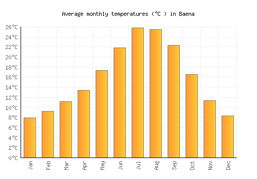 The bar chart below shows the average monthly peak daytime temperatures at Baena