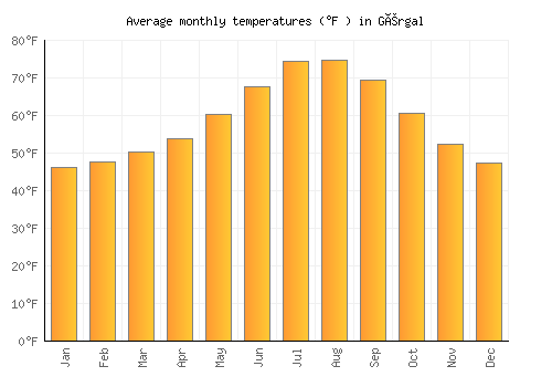 | Max °F | 46.2 | 47.7 | 50.5 | 54 | 60.3 | 67.6 | 74.5 | 74.8 | 69.6 | 60.8 | 52.5 | 47.3 |