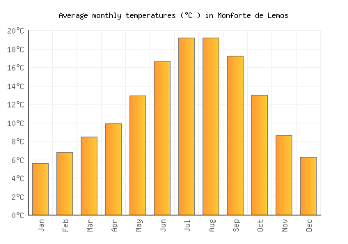 The bar chart below shows the average monthly peak daytime temperatures at Monforte de Lemos