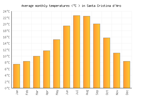The bar chart below shows the average monthly peak daytime temperatures at Santa Cristina d'Aro