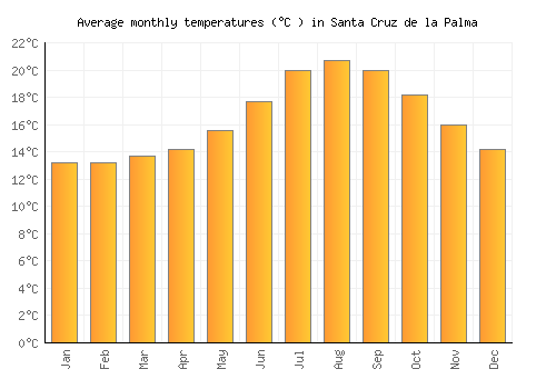 The bar chart below shows the average monthly peak daytime temperatures at Santa Cruz de la Palma
