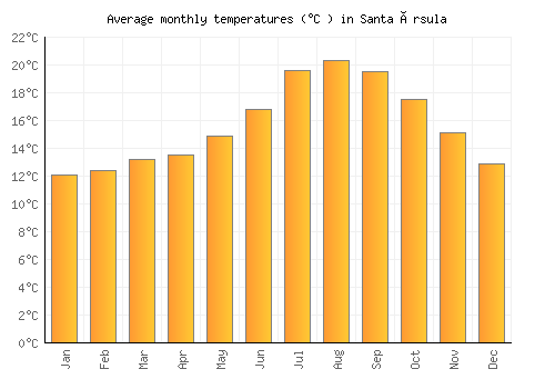 The bar chart below shows the average monthly peak daytime temperatures at Santa Úrsula
