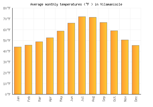 | Max °F | 44.1 | 45.7 | 48.7 | 52.5 | 58.8 | 66.2 | 72.1 | 71.4 | 66.7 | 59 | 50.4 | 45.5 |