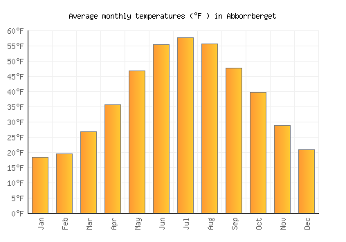 | Max °F | 18.5 | 19.6 | 26.8 | 35.6 | 46.9 | 55.4 | 57.7 | 55.6 | 47.7 | 39.7 | 28.9 | 21 |
